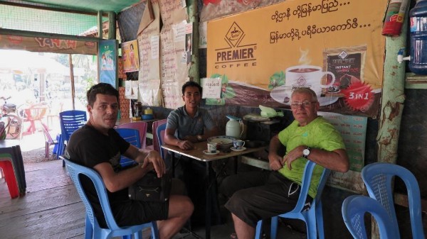 Mit Blick auf die Irrawaddy Brücke, trinke ich mit Ingo einen Kaffee.