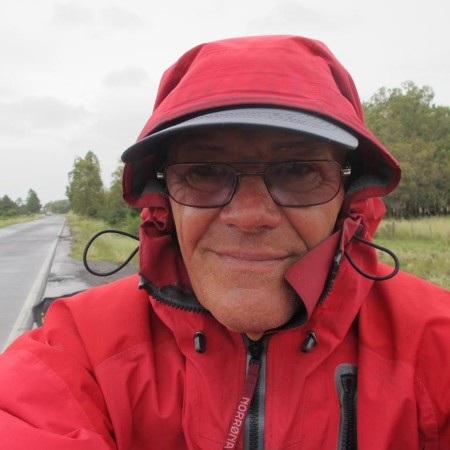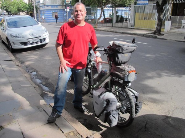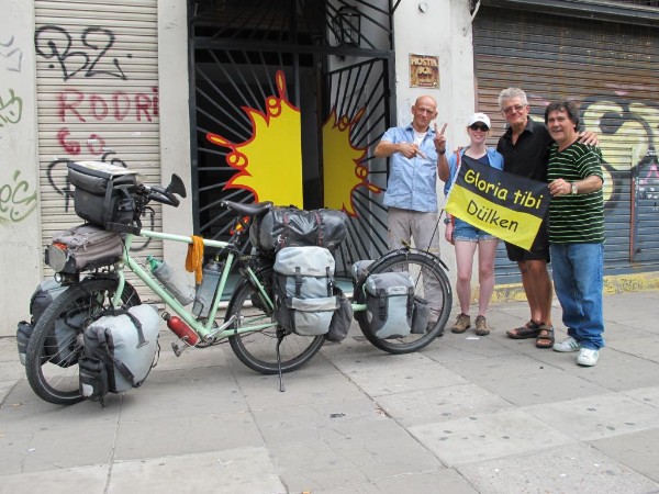 Die Taschen sind gepackt und vor dem Hostel habe ich das Dreirad beladen. Dort werde ich unter anderen von Claudia aus Neuss, Robson aus Antwerpen und dem sympathischen und meist gut gelaunten Angestellten vom Hostel ( Leider den Namen nicht aufgeschrieben ) verabschiedet. Laurent aus Frankreich hat das Foto geschossen.