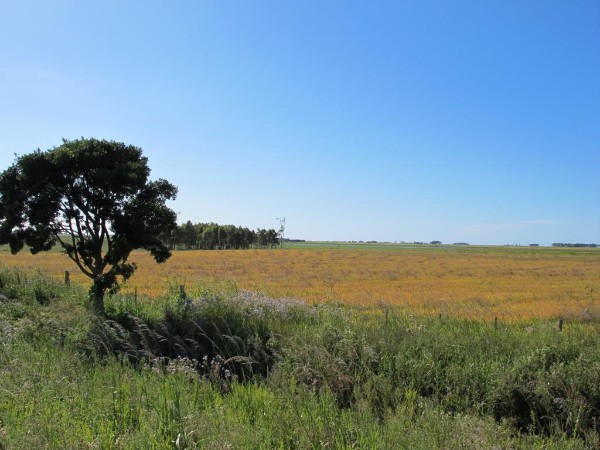 Von dort auf die RP 56 die dann beim Ort G.Conesa und Tageskilometer 95 in die RP11 mündet. Die Regenjacke kann ich erst jetzt ausziehen, denn es klart auf aber der Gegenwind wird umso stärker. Die Landschaft ist seit ich die Küste verlassen habe die Gleiche, Felder, Wiesen und Auen und ab und zu ein Bach. Auffällig sind die vielen toten Gürteltiere und kleine Schlangen die am Straßenrand liegen.