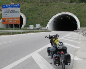 Am 27.04. Morgens um 6:45 Uhr spuckt mich die Faehre an Land. In Igouminitsa ist es noch ruhig. Ich fahr die naechste Tankstelle an um meine Spritflasche auf zu fuellen und eine Karte vom Land brauch ich noch. Auf die Frage nach dem Weg ,raet mir der Tankwart zum High-way, der ist mal gerade 1.5 Jahre fertig und hat rechts einen 2 Meter breiten Seitenstreifen " Keine Problem hier Griechenland nix Germanya" hoere ich noch sagen und ich kurbel die erste Steigung hoch.