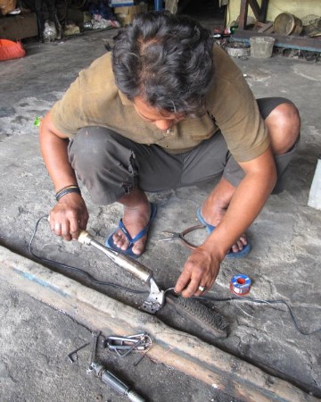 Der Vorderrad Ständer aus Alu ,den ich in Kambodschia schon mal habe hartlöten lassen, war wieder gerissen. Also nochmal löten lassen, denn bis Australien muss er noch halten.