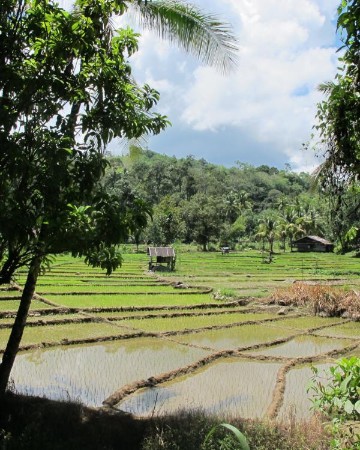 Zum Fluss hin haben die Bewohner ihre Reisfelder angelegt. Ein wunderschöner Anblick von hier oben, wenn sich die Sonne in den bewässerten Feldern spiegelt.