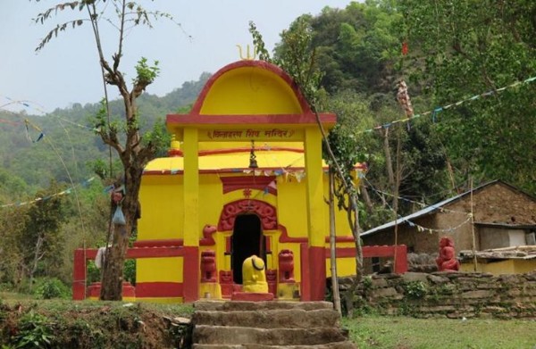 Nach dem ich die Schätze ins Hotel getragen habe will ich mir die Swayambunath Stupa anschauen. Die Tempelanlage liegt ca. 4 Km westlich vom Hotel wo ich residiere. Der Weg führt quer durch Thamel über den Fluss Bishnumati was man eher als Abwasserkanal bezeichnen kann, nach der Farbe und dem Geruch zu urteilen. Auf einem Nebenweg komme ich an einem kleinen Tempel. Ich ziehe die Schuhe aus und betrete die Anlage.