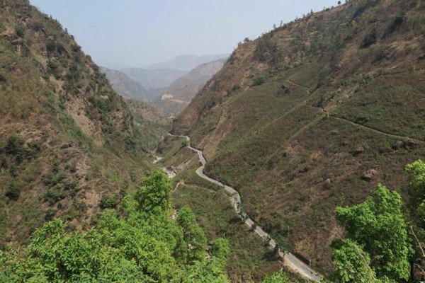 Um kurz vor neun Uhr, zwei Stunden nach dem Start in Thamel, habe ich auch den letzten Vorort Thankot hinter mir gelassen, wo ich nach einem kurzen Anstieg auf 1482 m die Passhöhe erreiche. Eine steile Serpentinen Abfahrt ist von Oben zu erkennen und eine Blechlawine quält sich durch das Tal.