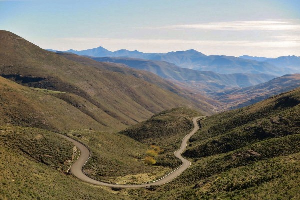 Anschließend hält die Straße die Höhe und schlängelt sich den Hang entlang, um dann in einer rasanten Abfahrt ins Tal zum Ort Likalaneng (2212m) zu gelangen.