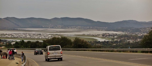 Blick auf die Lagune von Knysna, die nur eine schmale Verbindung zum Meer hat. Danach geht es den ersten Hügel hoch, zum aufwärmen, denn es sind gerade mal 15 Grad. Oben angekommen hat man einen schönen Ausblick auf den nächsten See.