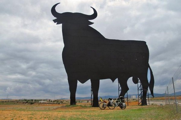 Vor mir liegt das Autobahnkreuz Toledo / Madrid und links davon mein Ziel für heute die Stadt Consuegra. Dann sehe ich auf der anderen Seite den Osborne Stier und die Idee ist geboren. Ein Rad Foto, direkt am schwarzen Stier, der mittlerweile zum Symbol für Spanien geworden ist, muss her. Aber wie komme ich da hin. Die Autobahnen sind eingezäunt hier in Spanien. Zwei Meter im Durchmesser sind die Drenagerohre unter der Autobahn die ich nutze um auf die andere Seite zu kommen. Jetzt nur noch den Hügel hoch und ich stehe vor dem 14 Meter hohen Stier, bestehend aus 70 Metallplatten (150 qm) mit einem Gewicht von 4 Tonnen.