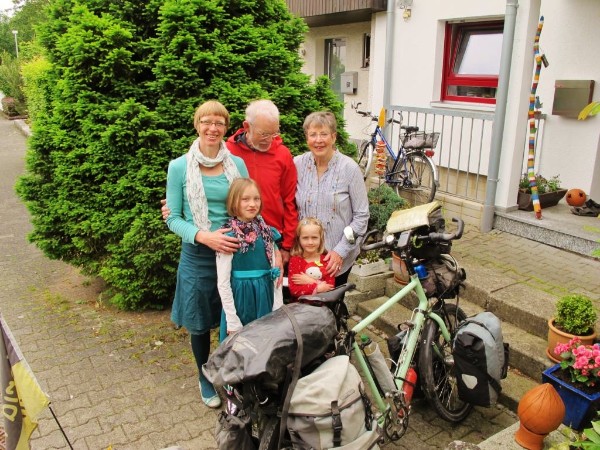 Mittagspause mache ich im Dorf Hergensweiler und rolle dann runter nach Lochau. Dort hole ich beim Bäcker ein paar Teilchen, denn es ist Kaffeezeit als ich beim Elternhaus von Camilla ankomme. Alle sind sie da, Maria, Jan und Camilla mit den Kindern. Was mich riesig freut, Hannelore und Ander aus Innsbruck, die mich auf meiner Italien Etappe 2011 begleitet haben, sind auch gekommen.