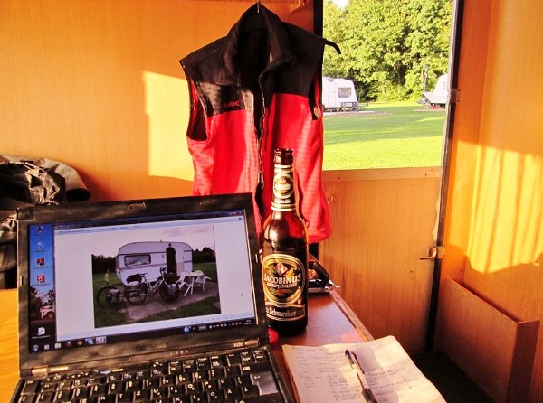 Nach dem das Zelt steht, das Abendessen gekocht ist und es gemundet hat, gehe ich in den Biergarten hier auf dem Platz, weil dort Internet und Strom ist. Ein Schild begeistert mich besonders und ich glaube ich bleibe bis Morgen. Oder ? aber irgendwo ist da ein Haken aber wo?