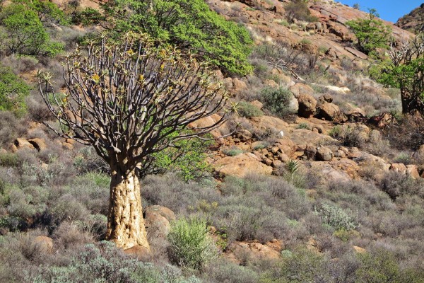 Mal sieht es aus wie von Riesenhand auf einander gestapelte Felsbrocken, mal fügen sich die Steine wie ein Putzel zusammen und dazwischen die Köcherbäume die ihre filigranen Äste in den blauen Himmel recken.