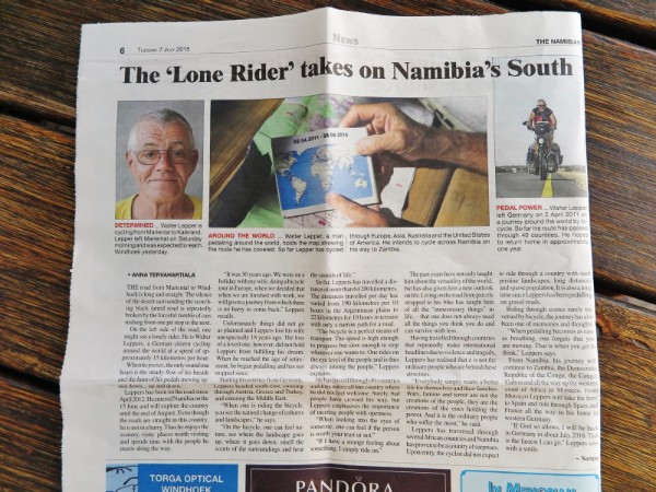 Heute in einer Woche muss ich leider wieder nach Hause fliegen. Klar freue ich mich auf meine Lieben zuhause, doch ich würde auch gerne noch eine Zeit lang mit Walter weiter radeln. An dem Tag wo ich nach Deutschland zurück fliege, also am 06.08. kommt ein Radfreund vom Walter, Heinz Mariner aus Bruneck, in Windhoek an. Die Beiden haben sich am 27.04.14 zufällig in USA getroffen und eine Stunde gequatscht. Seitdem sind sie immer über Skyp und Internet in Verbindung geblieben. Heinz fährt mit Walter eine Zeit lang durch Afrika.