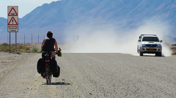 Nachdem wir alles verpackt haben, tragen wir alle Taschen zum Weg. Auf dem Platz ist der Sand so tief, dass man ein bepacktes Rad fast nicht schieben kann. Um 8:15 Uhr rollen wir endlich los. Wir müssen die 12 km schlechte Piste, die wir gekommen sind wieder zurück um dann Richtung Solitaire zu fahren. Die ersten 4 km kommen wir ganz gut voran als plötzlich Wind aufkommt, der sich in kürzester Zeit zu einem Sturm endwickelt. Die letzten 1,5 km bis zur Kreuzung muss ich schieben. Der Sturm drückt mich fast um. Dazu kommt noch die starke Staubentwicklung. Nach 2 Stunden erreiche ich die Kreuzung an der Walter auf mich wartet. Ab hier geht es wieder einigermaßen. Der Tacho zeigt 16 km als neben uns ein Pickup hält. Unser Fahrer Matthias, der uns gestern nach Sossusvlei gefahren hat, grinst uns freundlich an und bietet uns eine Mitfahrgelegenheit an. Das lassen wir uns nicht zweimal sagen und die Räder werden schnell verladen. Walter und ich fahren auf der Ladefläche mit, da Matthias noch zwei Mitarbeiter im Auto sitzen hat.