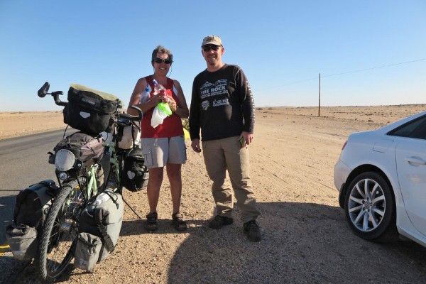 Es ist Zeit fürs zweite Frühstück. An einer Raststelle mit Tisch und Bänke habe ich gerade Platz genommen, da stoppt ein Wagen mit ZA Kennzeichen und der Fahrer fragt ob ich noch Wasser brauche, als ich verneine schenkt er mir einen großen Beutel Dörrfleisch schüttelt mir die Hand und fährt weiter. Nicht genug der besonderen Begegnungen. Ein Wagen fährt neben mir und fragt mich auf Deutsch ob ich mal anhalten könne. Ein junger Mann steigt aus und sagt zu mir: Du wirst es nicht glauben wo ich her komme. Ich kapiere erst gar nicht was er meint, dann stellt er sich vor, Klaus Knuffmann aus Dülken Kolpingstraße 8 und ich denke das kann doch nicht möglich sein hier einen Dülkener zu treffen.