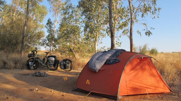 Der Mantel des Vorderrads hat fast kein Profil mehr und des halb anfälliger für Pannen. Aber das ist schon Routine und in einer viertel Stunde kann es schon weiter gehen. Mein Tacho zeigt nachmittags 44 Grad auf dem Rad an und kein Schatten in Sicht. Nach 112km, es ist 17:30 Uhr, finde ich einen schönen Platz um mein Zelt für die Nacht aufzustellen.