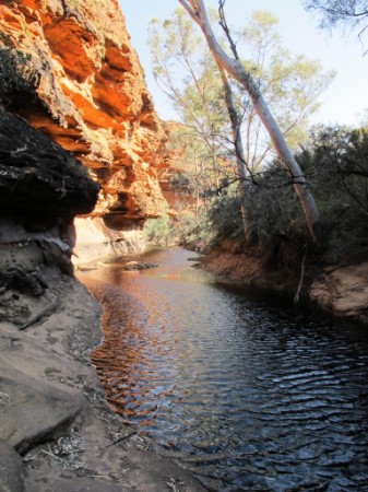 Um 3 PM stehe ich, wie ein Kind das mit großen glänzenden Augen den Weihnachtsbaum bestaunt, vor dem Kühlschrank mit Bier, der in der Anmeldung vom Kings Canyon Resort steht. Bevor ich irgendetwas anderes mache zische ich mir eins. Das ist Balsam für meine ausgetrocknete Kehle. Danach checke ich ein für drei Übernachtungen und suche mir ein nettes Plätzchen, in der Nähe von den Cabins, so dass ich mir dort Tisch und Stuhl aus leihen kann. Zum Abendbrot koche ich mir Spagetti und beobachte das Treiben mir gegen über, wo drei Jugendgruppen ihr Lager aufgeschlagen haben.