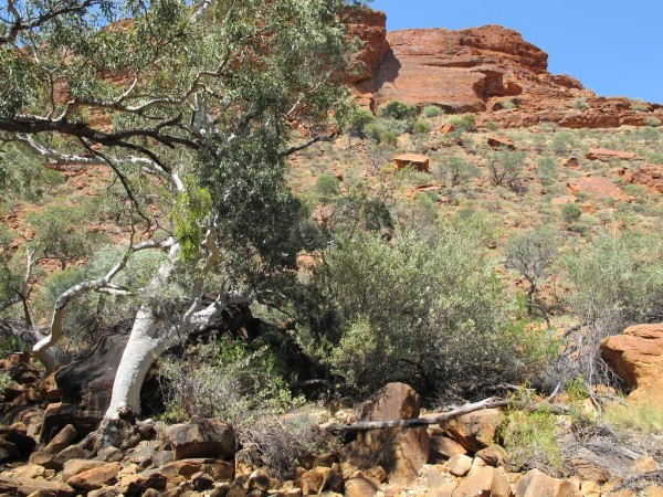 Gestern Abend, ich wollte mich schon schlafen legen, kommt Lukas aus Leverkusen der hier für eine Weile arbeitet, (Work & Travel) und lädt mich auf ein Bier an der Bar ein. Da lasse ich mich gerne überreden. Wir erzählen noch lange und bei dem einen Bier bleibt es auch nicht." Auf einem Bein kann man ja nicht stehen". In der Nacht streunen einige Dingos ( Australische Wildhunde ) auf dem Campingplatz herum und suchen nach etwas fressbaren. Am frühen Morgen versuche ich so leise wie möglich meine sieben Sachen zupacken, um nicht die Jugendgruppe auf zu wecken, die gestern Nachmittag noch angereist ist. Sie liegen auf Isomatten und in Schlafsäcken gehüllt, unweit von meinem Zelt. Dreiviertel Sieben strample ich grobe Richtung Osten. Es ist hier wie im Tableland ,rauf und runter verläuft die Straße durch das Mac Donnell Gebirge.