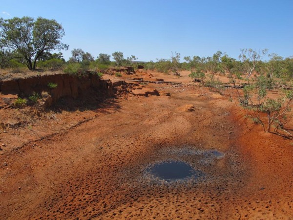 In Atitjera , eine kleine Siedlung mit Tankstelle und General Store, fülle Benzin und Wasser auf. Einen Liter Frischmilch Kaffee und eine Büchse Bohnen wandern in die Packtaschen. Der Sturm hat nachgelassen, dafür wird die Piste immer schlechter und ich gerate häufiger in Sandlöcher, die mich vom Rad holen. Eine kraftraubende Angelegenheit.