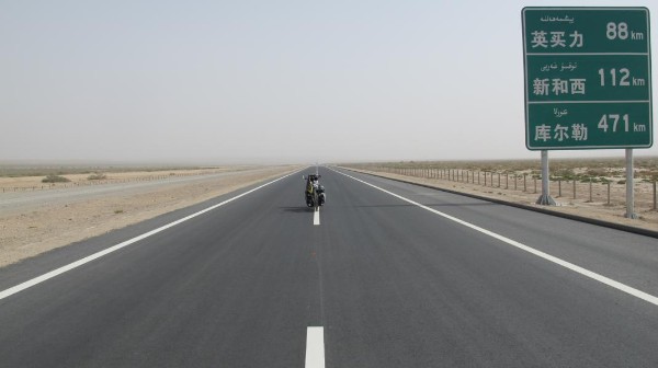 Ab und zu ist auch mal ein Stück Sandwüste dazwischen. Bei Kilometer 70 fahre ich auf die nigel nagel neue Autobahn die parallel zur G314 verläuft .