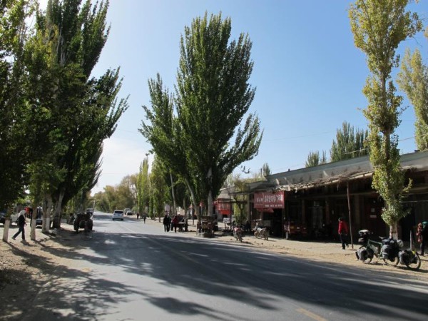 Vorbei an einer Allee radele ich durch die Vororte von Dunhuang und bin um 13.00 Uhr in der Stadt.