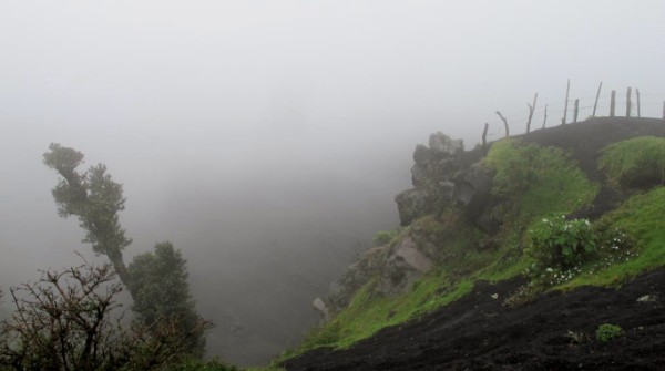 Das Ende des Lavastroms , der zurzeit nicht mehr fließt aber noch genügend Hitze abgibt um Marshmallows zu grillen. Der Abstieg erfolgt auf dem gleichen Weg. Hier und da ermöglichen Wolkenfenster Blicke ins Tal oder auch zu den Nachbarvulkanen.