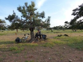 zwischen alten Arganen gefunden. Vom nahen See begrüssen uns die Frösche mit einem Konzert. Wir kochen uns Nudeln & Tee , ein kleines Lagerfeuer erzeugt schnell eine gemütliche Atmosphäre. Als das Feuer niedergebrannt ist kriechen wir in unser Zelt und in die Schlafsäcke.